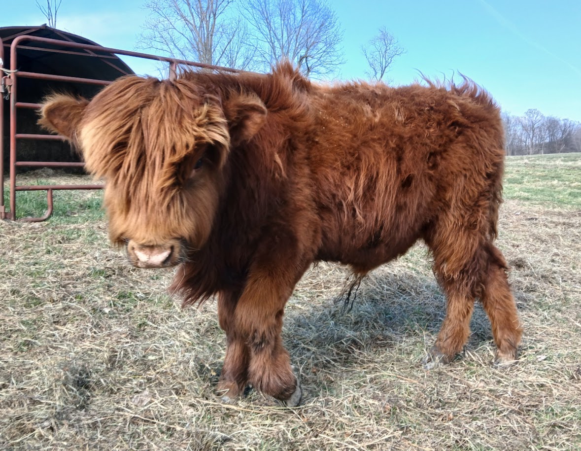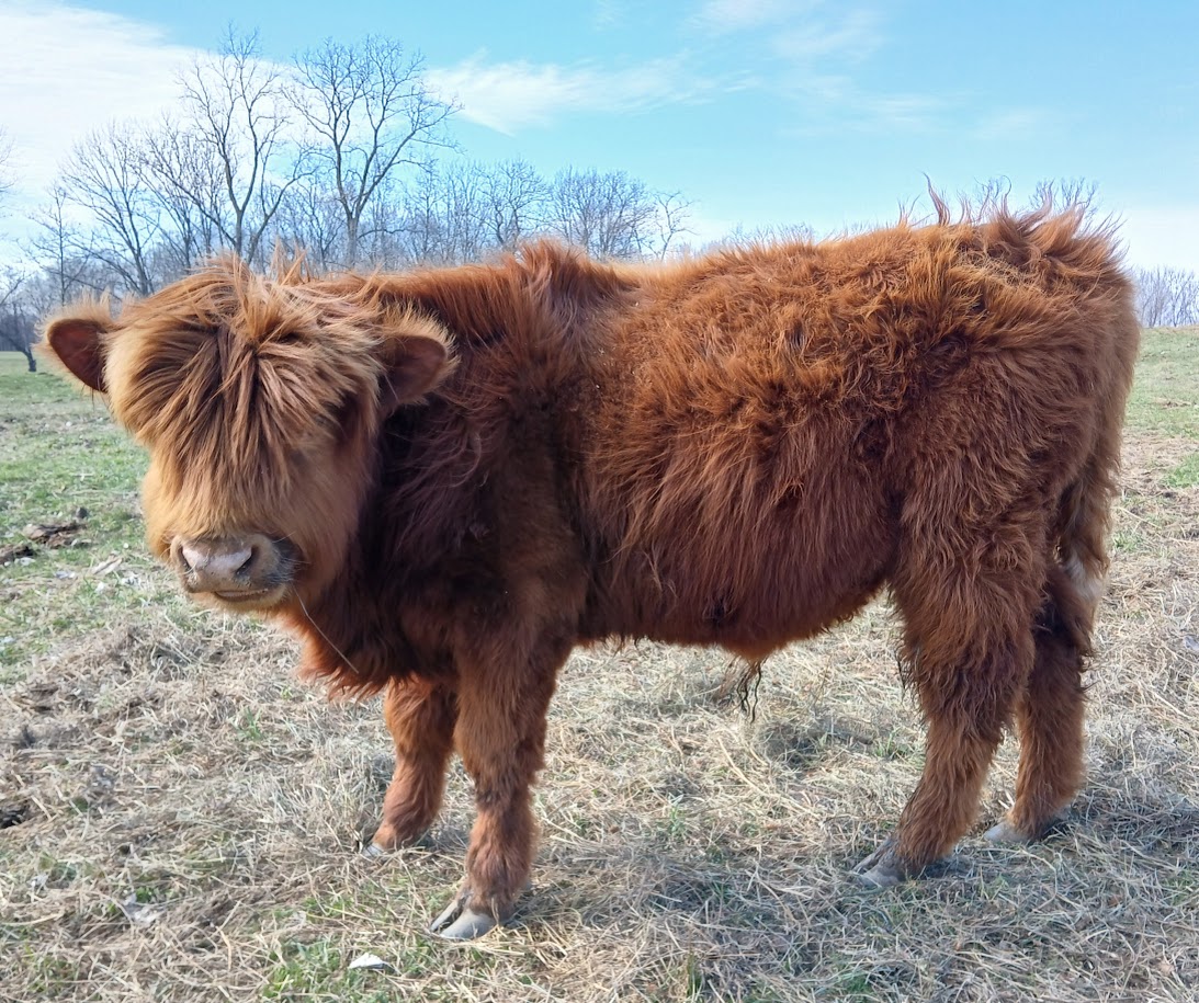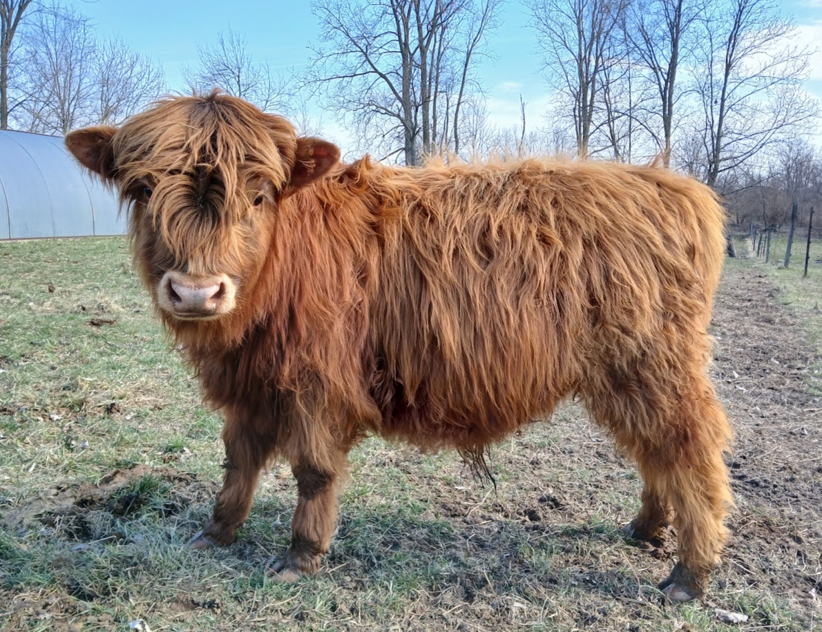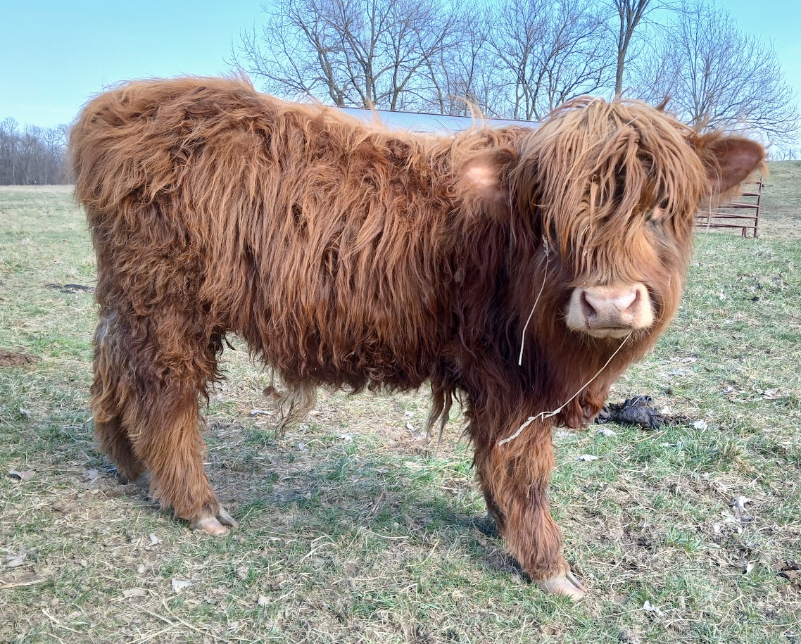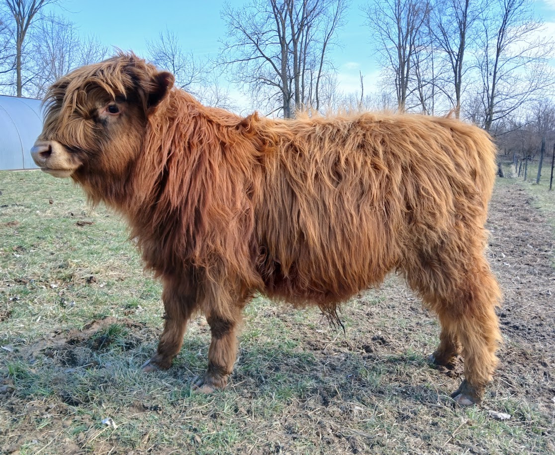 Equinox is a great bull he is 3/4 Scottish Highland, 1/4 Dexter. He is friendly and loves scratches. All our cattle are hot wired trained.